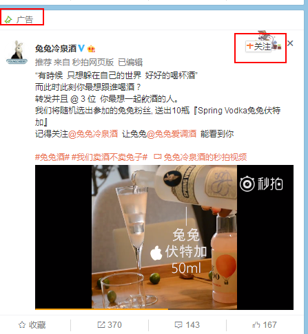 广告文案是从抛出问题“你想和谁喝酒?”开始的,喝酒其实就跟吃饭一样,需要找一个对的人,一个对的人可以畅谈,若是人不对,喝的酒也只是闷酒。 广告文案抛网络营销的优势有出问题以后,广告主选择做抽奖转发的活动。用户的参与方式也很简单,转发并@3位好友,就有可能能获得兔兔伏特加哟! 抽奖转发活动是微博营销最常使用的推广方法,也是做微博账号推广最高效的推广方法。 广告创意素材是以视频的形式,视频跟大家分享了伏特加的饮用方法,以及产品内容的介绍。 广告主选择投放微博广告不仅能够根据微博独有的三维立体定向人网站开发昆山群技术来找到对广告有需求的目标用户,还能做品牌的推广,让用户在万千信息流中,记住品牌信息,记住品牌。 我们在做微博粉丝通广告时,最好能够有1-2句简单好记的广告词,无论我们是选择哪个平台做广告推广,最重要的是让用户记住品牌和产品,用户只有通过投放的广告记住产品以后,我们才能说我们投了一次好广告,广告获得超好的广告效果。
