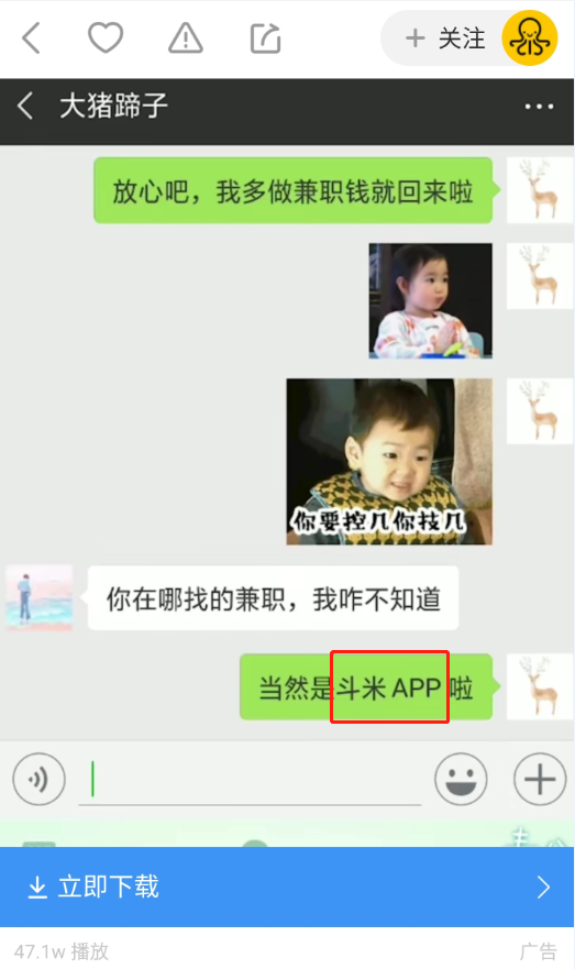 快手广告平台此次为斗米APP设计的广告就是以情侣间的聊天为切入点,由女生给男生发红包买礼物引出后面的女生用斗米APP做兼职赚钱。故事情节对有对象的,零花钱不多的人来说,富有吸引力。快手广告平台在广告视频播放结束时,为斗米APP设置了3-5秒的品牌LOGO展示时间,让用户加深印象。 宣传海报科技素材