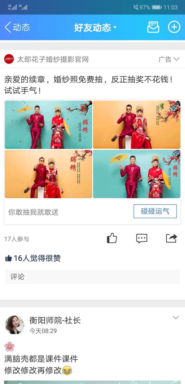 外层文案都跟平时看到的一样,一张大图/九宫格,而我们今天看到的是四种不同摆拍姿势的成品图片。 广告创意是婚纱照免费抽,抽奖免费不受限,人人都可以参与! 好哒我们视线上移,看到广告字样。广告旁边有一个小三角,点击广告,你会发现什么呢?