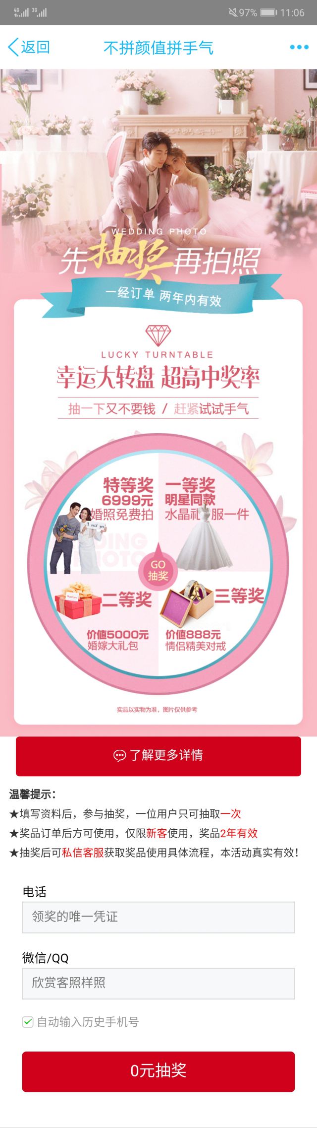 广告详情页惊喜多多,有婚纱照免费拍的特等奖,还有婚纱礼服的一等奖、婚嫁大礼包二二等奖和精美对戒的三等奖。公关危机第一集插曲抽奖活动是免费抽,只要抽就都能中奖。 对于用户而言,参与这种活动,几乎都稳赚不赔,参与活动 以后大家别忘了留下自己的联系方式哟,不然精美礼品怎么领呢? 小编在QQ空间看到的不一样的婚纱摄影广告,你有兴趣吗?