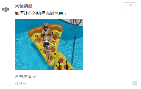 大疆创新是售卖无人机的,通过使用无人机拍摄,可以看到更宽、更广的世界。(讲真的,如果不点击广告详情,是真的不知道是要推广什么产品,让最不像广告的广告成为广告,大概就是信息流广告的最高境界)危机公关企业公司 大疆创新的无人机广告视频主要是从产品功能、操作流程来把握用户痛点的。 这次广告不仅仅在用户之间形成口碑传播,而且通过广告企业和用户之间能够直接达成沟通,如果用户想要购买体验,也可以通过广告完成。 通过大疆创新投放的微信朋友圈广告,我们可以得到以下结论: 1.单品营销组合策划的选择很重要,选择单品时一定要选择实用性强,能够抓住用户痛点的商品; 2.如果单品时垂直类产品,我们在后台广告投放时,可以直接将广告投放给有需要的用户,避免广告费用浪费、