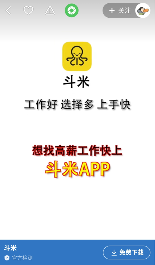 平台上用户数量基数大,大部分来自三四线城市,生活节奏较慢,有较多的空闲时间,他们乐意通过做靠谱的兼职增加自己的收入。斗米APP在快手广告平台投放广告,用户特征契合度高。