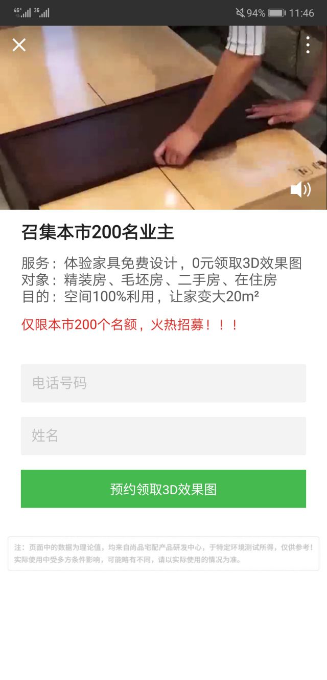 点击广告是个沉浸式落地页,落地页可分为两部分,一部分是视频介绍,还有一部分是召集本市业主,利用家具变形可让屋子空间变大20㎡,免费家装设计,还能够帮出3D效果图,并且免费参与活动。 我们在投放家装类广告时,可以在广告投放进行定向设置,根据用户的历史浏览行为记录、兴趣爱好以及所在区域、年龄等来进行筛选,把新闻自动发布广告投放给有需要的目标用户,也能够大大提升广告投放的精准度。