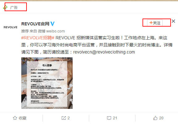 REVOLVE是美国的轻奢时尚网站,是美国一个知名的线上时尚一站,每天都有数十款当季潮品上新,最近REVOLVE需要招聘新媒体运营生,大多数的招聘广告都是通过垂直类招聘APP/企业官微/企业官方微信公众号等等,而REVOLVE刷新了我对微博广告的看法,因为REVOLVE将招聘广告通过微博广告啦!