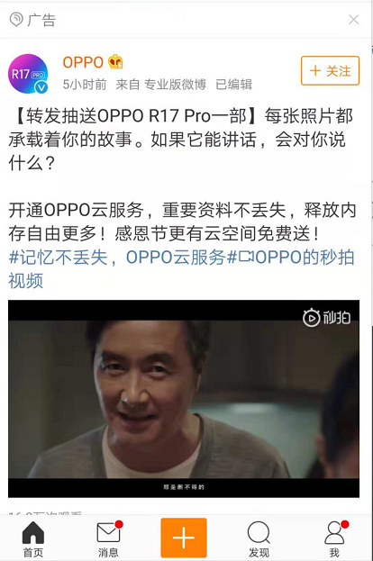 正值感恩节,OPPO官方微博推出感恩节云空间免费送的活动。此次广告文案一开始先用转发送手机,吸引用信息流信息推广户。然后用精彩的文案直击用户痛点“重要资料不丢失,释放内存自由”。广告视频通过展示在几种情况下,需要我们删除一些照片来拍摄新的照片时,我们的纠结与不舍,然后再向大家展示了一键开通云服务,这些烦恼统统解决。