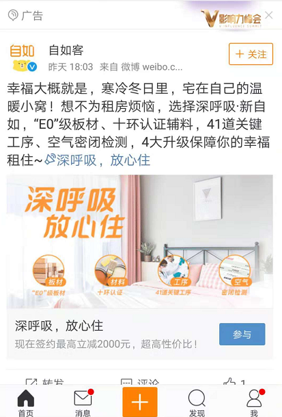 自如此次选择投放微博广告,文案部分从冬日的温暖小窝出发,大家常见的引出租房烦恼;接着为大家提出解决方法,引出自己数字营销 概念的品牌,同时介绍自己的优势所在,给人以说服力。文案结束部分是一个锚文本链接,用户可以点击下载APP。下方是一张图片介绍了品牌4个独特的优势,同时图片附有链接,用户也可以点击图片下载。广告最下方是一个签约减免现金的活动,活动力度很大,对租房人群非常具有吸引力。 此次广告的目的是为了获得更多的AP著名的危机公关案例P下载量,所以我们推荐给广告主 (有效互动)的计费模式,达到广告效果的同时,也不浪费资金。