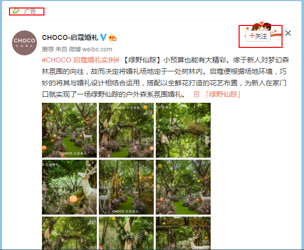 广告主是谁? 启寇婚礼~首先启寇婚礼是一家婚庆策划公司,可以根据用户喜好来私人订制婚礼设计还有婚纱照的拍摄~ 广告选择的广告创意素材是什么? 广告创意是运用的启寇婚礼策划的婚礼活动的成功案例,并且广告文案也充分介绍了婚礼大环境。户外婚礼本身预算高,无策划不营销而且未知性强,而选择启寇婚礼就有你意向不到的结果。 小的广告预算就能够帮你打造一场绿野仙踪的户外森系婚礼~看到选用的广告图片你有心动吗?如果是我,我会有些许心动! 用户体验流程是什么? 用户点击链接会跳转启寇婚礼官网,通过官网我们可以查阅更多婚礼风格,并且通过在线咨询,也可以获取自己心仪的婚礼风格的报价。 选择投放微博广告有什么好处? 1.品效合一:微博粉丝通广告最大的优势就是既能让更多的用户知道品牌,也能够让用户了解更多关于婚礼方面的小知识,并且让用户产生在哪家网站建设比较好线咨询。 2.预算可控:微博粉丝通广告可以精准投放,可以指定广告投放区域、广告的投放时间以后把广告投放给谁,还可以设置广告每天的推广预算。