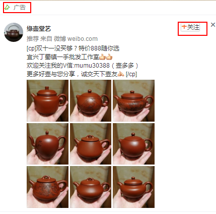 广告是选择的微博九宫格图文广告,这个广告是夹杂在平台本身的信息流之中的,广告创意图片就是自行制作的陶壶,通过看文案我们就可以看出广告主的推广目标就是微信加粉。 陶艺坊投放微博粉丝通广告有这么几种投放方式: 1.官网 如果陶艺坊规模较大,我们可以直接推广官网,用户点击广告即进入企业官网,能了解到更多详情; 2.淘宝购物详情页 如果是想直接推广手工陶艺品,恰好有淘宝店铺的话,我们可以直接推广淘宝链接,用户点击广告即进入淘宝,用户可看到用户平台并直接构面产品; 3.落地页 落地页是最常见的方式,用户点击广告即跳转落地页,落地页可呈现的内容更多,比如企业介绍+产品介绍+制作工艺介绍等等,在尾部的时候还可以通过表单收集客户资料等等。