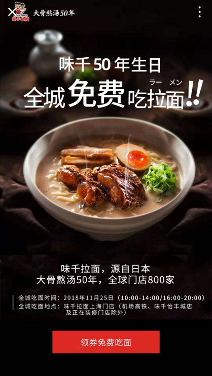 味千拉面在50周年来临之际,为了回馈广告消费者,发起了“全城免费吃拉面”的活动。针对此次活动,味千拉面选择在微信朋友圈投放广告。广告文案只有三句话,对品牌和活动进行简单描述。广告外层页上由一碗诱人的拉面图片和活动标题组成,点击外层页图片,会跳转内层原生推广页,用户也可下方了解更多进入原生推广页。在推广页用户就可以网络销售和网络推广了解活动详情,参与活动了。