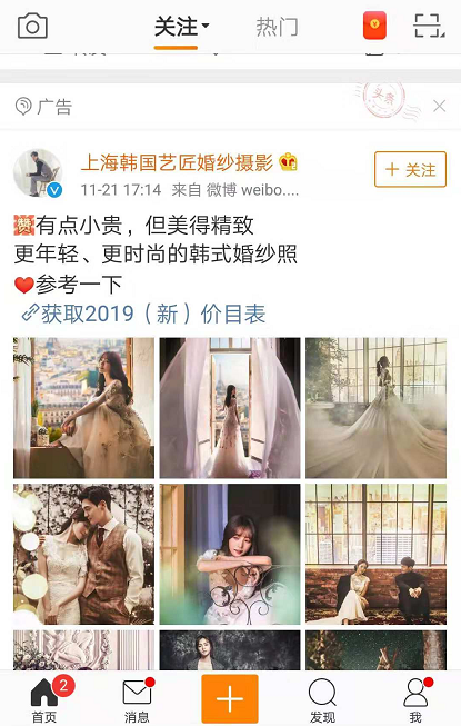 韩国花艺此次投放微博粉丝通广告,广告文案在精简的同时又能表达出产品的特点:贵、精致、更年轻、更时尚。用户在看到广告的时候一下就能Get到产品特色。对于感兴趣或者有需求的用户还可直接点击下方链接获取最新报价。广告图片部分是9张精美的婚纱照片,非常吸引用户查看。 微博平台拥有1.2亿+的日活跃用户,投放粉丝通广告可以根据用户属性,兴趣标签,地域等进行定向投放,广告更精准。用户还可将看到的广告进行社交推荐以及关系传播,实现广告的原生传播,用户更容易接受。