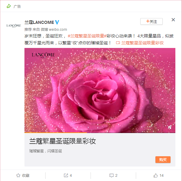 对于女孩子来说,爱美是与生俱来的。小时互联网网络营销候看到大人涂口红,是很羡慕的一件事,你会不会拿妈妈的口红在自己嘴唇上乱涂乱画呢? 用过的彩妆那么多,你用过璀璨如繁星般的彩妆吗? 此次兰蔻投放微博广告,在圣诞来临之际,推出兰蔻繁星圣诞限量彩妆新品。兰蔻诞生于法国,是全球知名的高端化妆品品牌,主要面向教育程度、收入水平较高,年龄在25~40岁的成熟女性。作为法国国宝级化妆品牌,带着法兰西与生俱来的美丽和优雅,为世界各地的人们所熟悉和喜爱。 兰蔻此次的微博粉丝通广告以圣诞狂厦门 小程序欢为创意点,文案围绕“圣诞”展开,充满节日气氛,同时发起&ld定制小程序开发quo;兰蔻繁星圣诞限量”的话题,引起网友讨论,关注。文案广告语优美,突出产品特点。 广告视频通过模特涂抹向大家展示产品使用效果,更为直观。用户可以点击文案最后的链接跳转到天猫购买平台,查看每一款产品的详情,选择是否购买。 选择投放微博粉丝通广告,可以扩大品牌的知名度;用户可以通过广告进入购买渠道,能够增加产品的销售额;同时用新品活动还能吸引一批忠实用户。