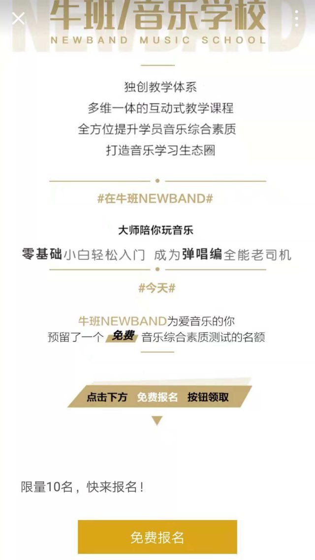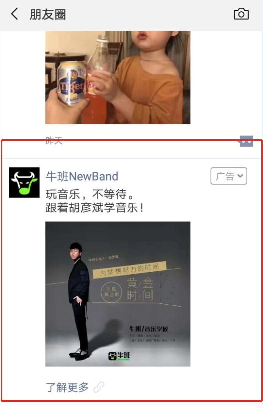 牛班是全能音乐人胡彦斌和三位音乐圈合伙人于2014年创立的,致力于在线音乐教育行业。品牌危机公关是什么针对不同的学员基础,课程教学目标不同,注重实事求是,因材施教。 此次牛班选择投放微信,文案简洁而不简单,“玩音乐,不等待”,对喜欢音乐的人来说极具吸引力。最后利用胡彦斌的明星效应,让用户感觉权威,专业。图片是创始人胡彦斌的代言海报,点击图片或者下方的了解更多,跳转进入原生推广页。