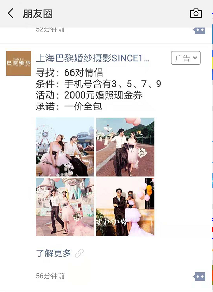 上海巴黎婚纱摄影 是由著名摄影师李绍白先生于1986年在某个小岛 高雄成立集团,1996年进驻内地,在上海淮海中路成立第一家旗舰店!爱情是法兰西最美丽的元素,而法兰西最美的地方就是巴黎。作为世界顶级婚纱品牌的上海巴黎婚纱,始终秉持一贯时尚前卫的风格,引领国际时尚潮流,以「流行、专业、欢喜、诚心」的经营理念来为每一位前来的新人服务。 上海巴黎婚纱摄影此次投放微信,可以通过LBS技术,将广告精准推送给周边人群。而且微信朋友圈广告非常适合品牌推广,点击外层页图片或者下方链接可直接跳转到落地页,体验流畅,在落地页,用户可以详细了解品牌,个人网络免费推广参与活动等,操作方便,用户容易接受。