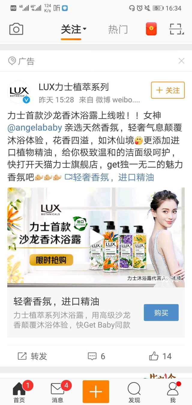 知名品牌LUX力士边缘计算以种类繁多的产品适应消费者的不同需求,LUX力士卓越的香氛品质和独特的明星气质早已深入人心,品牌始终与国际巨星交相辉映,她们不仅是美丽的代言人,更是具有LUX力士个性的代言人——时尚,性感,自信微信精准引流,魅力 我们都知道力士,是一个享誉全球的著名品牌,历来以卓越的品质和独特的明星气质深入人心,此次选择在微博投放广告,利用明星效应angelababy,不但美丽,也代表了力士一直以来的时尚、性感和自信的品牌个性。