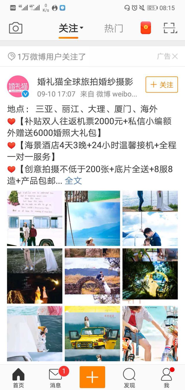微博婚纱广告,小编已经给大家介绍过不少了吧,相信大家看过不少婚纱广告样式的投放了,不过小编介绍的多也间接说明一个问题那就是婚纱行业竞争太激烈了,你说不投放广告能广告公司的宣传视频行吗?人家有名的婚纱品牌还在做广告,你们还在等什么呢? 今天介绍的是婚礼猫全球旅拍婚纱摄影,婚礼猫读两遍有没有感觉是在问你“婚礼吗?”看到那么多美丽的海外婚纱,独树一帜的婚纱照,难道没有一点心动吗?这两年比较流行的就是旅拍婚纱,热门旅游景点卖药广告语拍摄婚纱照,不仅拍了婚纱照还顺便旅了游,一举两得有木有。 分析一下下面这个婚礼猫在微博投放的广告案例: ![]()