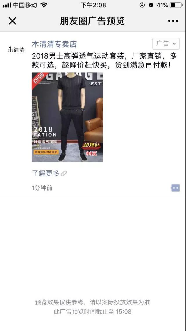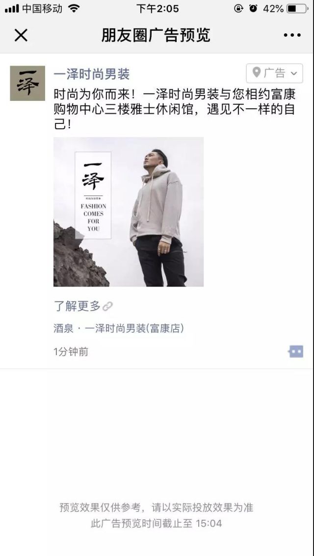 +品宣: 提升品牌价值 朋友圈广告基于微信10.4亿的月活用户群,以及自带社交基因的微信ATO营销闭环;它利用社交行为洞察,通过兴趣、消费能力、品牌偏好及需求意向等更多维度数据划定人群;原生信息流的广告形式不仅利于品牌展现自身优势,获得消费者的认同,用户点击广告拉起小程序页面,还可直接下单进行购买,有效提升转化率。 无论是门店服饰商家还是电商服饰品牌,都可以在朋友圈广告中找到适合自身的引流方式。 1、门店服饰商家