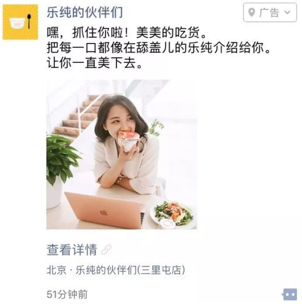 知名酸奶品牌乐纯的微信公众号“乐纯的小伙伴们”在朋友圈投放本地推广广告,以推广线上商城酸奶促销活动。由于乐纯酸奶一直走高端路线,深受白领女性的欢迎,广告也相应地圈定了北京朝阳区爱好旅游、金融、美食的女性群体。 外层使用白领女性的清新图片,引起用户共鸣;内层使用原生推广页,带来大方流畅的浏览体验,原生按钮直达H5商城页面,减少用户转化路径,轻松在同一个app里实现一键下单,最终广告效果点击率18.36%。