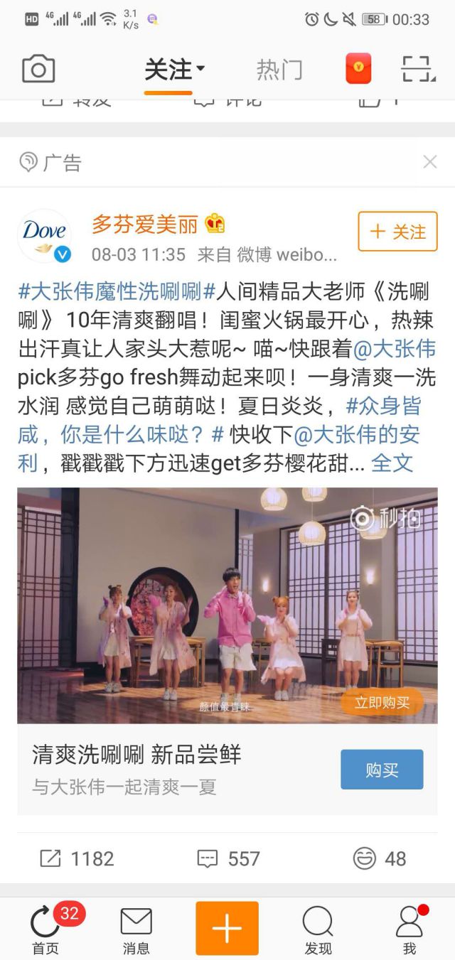 一直以全球突破性护肤科技呵护每一位女性的真实美丽,是全球著名的女性品牌,炎热的夏天,洗澡的时候是不是都习惯用沐浴露来洗掉身上的汗味,广告见得不少,但是多芬这次的广告真的是魔性颠覆我的世界观啦。 多芬此次选择微博信息流广告进行广告宣传,大张伟魔性洗刷刷,以生活中的最常见的事情为例子,推出多芬不同味道不同场合的使用,大张伟魔性洗澡舞不得不说非常吸引用户眼球。