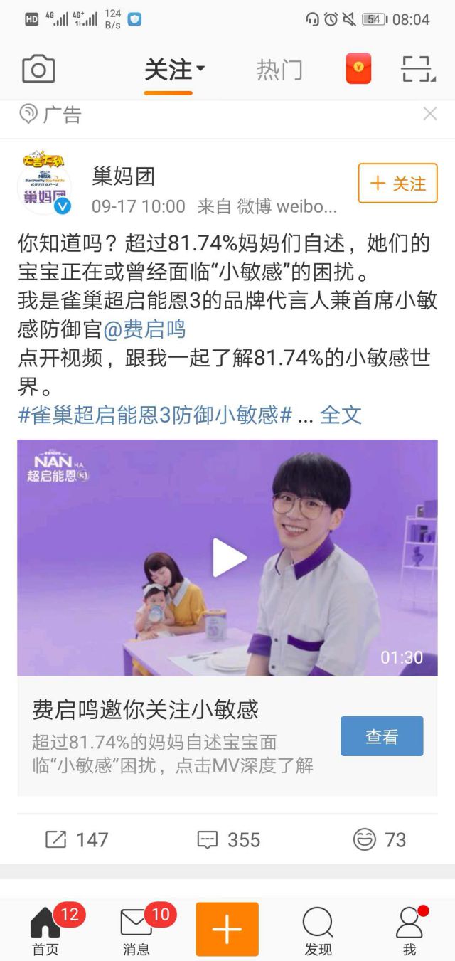 巢妈团是由雀巢(中国)有限公司打造的母婴社区平台。其专注于为妈妈们提供最贴心的专业咨询、致力成为孕妈妈和新妈妈们的服务及互助交流平台,努力为年轻父母打造潮流时尚的新型育儿观。 宝宝的健康一直以来都是备受关注的话题,尤其是奶粉的选择,几年前得三鹿奶粉事件,给快手视频了不少家庭一个深刻的印象,在奶粉这个问题上,非常严格,此次巢妈团在微博广告中投放广告,和代言人兼首席小敏感防御馆一起了解孩子的小敏感世界。 开头81.74%的妈妈们都会困扰的问题,会让大部分用户去关注这个话题,是什么问题,怎么解决,微博本身关注度就比较高,庞大的用户也使得微博广告的曝光率很高。 微博广告系统能够识别用户属性,例如年龄、性别、兴趣爱好、地域整合营销哪个好、设备等,并通过这些用户属性帮助广告主进行筛选,实现广告定向投放。因此推广信息所触达的用户是非常精准的,收到信息的都是对品牌感兴趣的意向用户或者潜在用户,进而提升广告转化率。