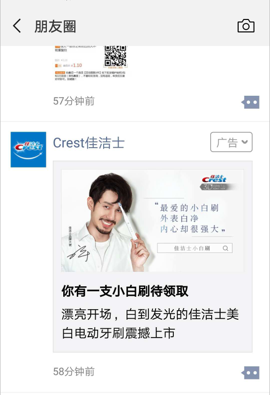 小提示:您应该对本页介绍的“佳洁士在微信朋友圈广告投放案例”相关内容感兴趣,若您有相关需求欢迎拨打我们的服务热线或留言咨询,我们尽快与您联系沟通佳洁士在微信朋友圈广告投放案例的相关事宜。