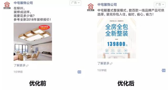 中宅装饰看重微信拥有海量用户、可精准触达目标用户、依托其社交关系链传播能够为品牌推广提供加成效应的特点,决定尝试使用微信朋友圈广告帮助品牌发声。 客户在没有经验的情况下进行的第一次投放,起初效果不太理想,在优化师的正确指引下,广告主利用A/B Test通过小成本的测试快速找到了更加适合自己的投放方案,在提升效果的同时也成功控制了成本。 1、定向优化 经过多次公关公司联系方式测试,优化师发现将定向设置为年龄+地域+商业兴趣时的广告点击率最高且转化成本最低,这样的定向设置为获得320万高曝光量打下了基础。 2、创意素材优化 最初的外层素材使用了精致的装修实景照片,但这样的设计对用户的吸引力有限,通过与广告主的沟通,在7月份的投放中,外层素材使用了凸显价格的方式来吸引用户点击。“全放全包,全新整装139,800元”的醒目文字引起用户想要一探究竟的好奇心,收获了不错的点击率。