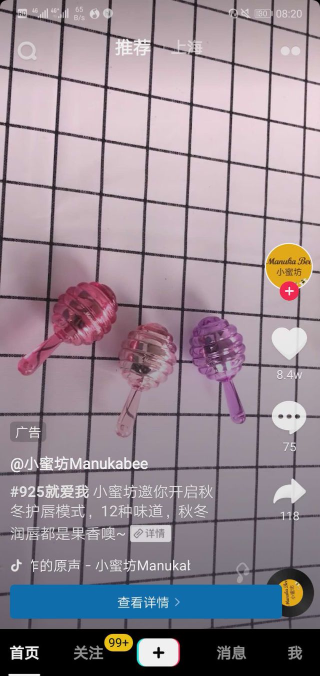 现在这个社会,品牌找对消费者定位最重要,而品牌消费者在哪,品牌就在那里,我们不难发现,美妆护肤广告经常出没与微博电视推广广告、维信和抖音,这是因为什么呢?微博、维信、抖音都是目前较为优质的营销阵地,备受广告主青睐的地方,此次小蜜坊也是抓住了这一特点,将广告投放在中。 现在消费者越来越偏向于年轻化,以“一支唇膏卖遍全球”的新西兰卓越的天然活机护肤品牌小蜜坊,卖年轻的产品,讲年轻的话,去年轻的地,全方位锁定年轻,小蜜坊此次深圳 全网营销抖音邀请消费者925就爱我挑战赛,借助抖音平台优势,与用户进行高互动,短短时间内点赞量8.4万。 ![]()