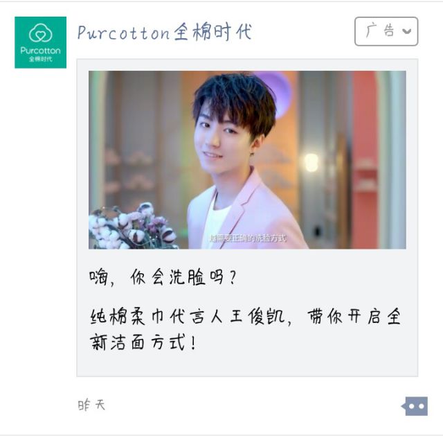 全棉时代听名字也能猜到是什么意思,经营范围包括家用纺织品、婴儿用品、一次性纯棉制品、化妆用品、服装、日用品、鞋、等无纺布制品的销售、说到棉,我们就会想到棉花,白白的软绵绵的,很干净舒服,全棉时代里的所有产品都是天然棉花作为原材料制作的产品。 在今年,全棉时代正式宣布王俊凯成为品牌全棉时代纯柔棉巾代言人,是这个品牌的首个代言人,王俊凯化身棉系少年出现在大品牌如何推广众面前,通过宣城小程序此次微信的投放唤醒人们正确洗脸方式。 ![]()