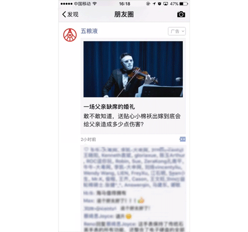 酒业品牌往往因为历史悠久或消费人群的缘故,留给人“传统”的刻板印象。但是在社交时代,已经没有什么品牌是传统的,只要有社交价值加持,百年品牌也能玩出新意。在今年的中秋佳节之际,微信广告深度合作五粮液、轩尼诗、水井坊等高端酒业品牌,探索新奇社交玩法,为节庆营销提供了一份出彩的范本。 讲好故事,以情沟通铸造品牌价值 讲好白酒品牌故事,不但能帮助品牌积淀深刻底蕴,赋予品牌性格,更能从情感的深度层次上激发消费者的共鸣,为品牌增值。 借助微信朋友圈基础式卡片,五粮液讲述了女儿出嫁时想起父亲点滴陪伴的感人故事,塑造出五粮液与施华洛世奇合作的新品“缘定晶生”作为亲缘、友缘与姻缘美好见证者的品牌形象和价值。 这则广告精准地呈现于高端酒水人群与施华洛世奇相关粉丝人群的朋友圈之中,并利用lookalike算法有效拓展触达范围,实现了品牌的高效曝光。同时,点击广告外层即可落地公众号文章,用户可观看长视频了解完整故事,更好地呈现创意并为品牌增加粉丝。数据显示,五粮液“缘定晶生”基础式卡片视频广告总互动点击率为行业均值1.6倍,点赞率为行业均值3.7倍,评论率为行业均值2.5倍,成绩亮眼十足。