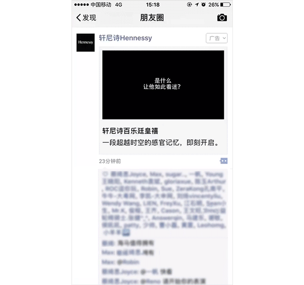 五粮液朋友圈广告示意 倾力缔造“甄选的艺术”的高端干邑单品——轩尼诗百乐廷皇禧,则是借助微信朋友圈基础式卡片视频广告,向大众讲述了调配总艺师品鉴与调配干邑的匠心故事。通过与目标人群进行品牌价值的深层沟通,轩尼诗百乐廷皇禧融力量与精细为一体的形象瞬间跃然眼前。 得益于京腾计划,一方面,腾讯社交大数据与京东电商行为数据合力为品牌构建全面立体的高端洋酒消费者人群画像,全面实现精准覆盖;另一方面,广告落地页可直接跳转至京东商城完成购买,打造从品牌感知到产生兴趣再到购买的营销闭环。数据显示,本次轩尼诗百乐廷皇禧广告总互动点击率为行业均值1.3倍,点赞率为行业均值4.4倍,评论率为行业均值4倍,借助品牌故事搭建了与用户之间的深度连接。