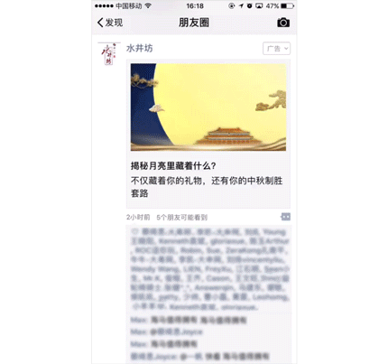 轩尼诗朋友圈广告示意 借势节日,以互动玩法引爆社交热度 具有互动性、趣味性的广告,能在加深用户参与感的基础上强化品牌与用户的情感连接。 水井坊借势中秋营销节点,洞察用户对中秋参与感的强烈需求,以用户节日饮用场景体验为中心,以“碰杯”送祝福的创意互动形式为内核,与用户进行情感上的深度链接互动,成功激发用户的参与热情。广告主视觉注重中秋氛围的渲染,用户通过碰杯送祝福的花式玩法聚焦品牌,通过现代化调侃式的祝福语引发共鸣,也展现了品牌在行业内的创新引领地位。 在人群触达方面,除了高端白酒人群,高端房产、高端金融财经等高消人群也被囊括其中,立体化触达目标人群。整合式广告投放为品牌带来极大社交热度,品牌微信指数当日提升14241%,广告总互动点击率为行业均值1.2倍,素材点击率为行业均值1.6倍,互动率位于行业前列,可谓成绩喜人。