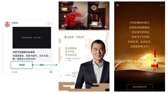水井坊朋友圈广告示意 除了在内容层面实现创新式互动,在广告形式方面,微信朋友圈选择式卡片广告也为品牌互动营销提供了更多玩法。 自古以来诗酒不分家,中秋节五粮液联合诵读节目《为你读诗》发起“明星为你读诗”品牌事件,并借助朋友圈选择式卡片广告,为IP合作增添社交价值。用户可根据自己的喜好二选一,或听陈建斌吟诵优美宋词,或听周涛朗读现代诗歌,在一曲新词一杯酒中,在传承千年的大国浓香里,感受中华文化的团圆与和美。 通过朋友圈选择式卡片广告,五粮液将古风今韵的不同素材合理穿插拼接在一起,并锁定高端白酒人群和既有粉丝人群,与之深度互动促成社交裂变,引发众多网友“走心”回复。数据显示,广告点击互动率为行业均值1.4倍,评论率为行业均值2倍,IP联动加社交互动让五粮液获得了高关注、高评论。