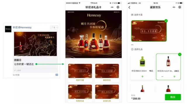 轩尼诗朋友圈广告-小程序礼品卡示意 在传统酒类转型的今天,社交营销的有效运用,已经成为品牌更好把握存量市场,不断扩充增量市场的不二法则。而深谙此道,海量社交大数据可帮助酒企精准定位核心消费者,强互动的丰富社交玩法可提升品牌营销效率,结合节日营销、联动营销等助攻策略,助力酒类品牌把握营销先机,以社交之巧力,得青睐及收益。