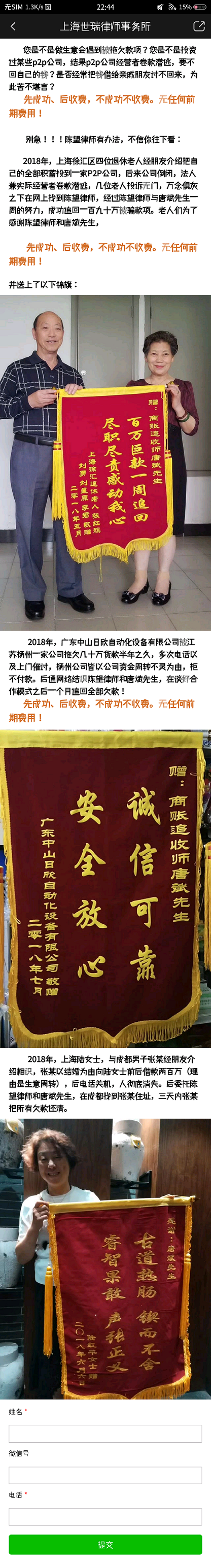 陈望律师,主要就是帮助大家追回欠款的,从“要不回钱不收费”的广告文案中就能够看出。咳咳咳,大家没有需要更好,当然如果有需要也可以找陈望律师,通过他来帮助大家追回欠款,维护公司/个人权益。 有人肯定会说,话都会说,连案例都么有,我怎么确定陈望是不是真的?万一他也是骗子呢? 为了解决大家的疑问,广告主在落地页的内容都有回答哟,大家仔看!