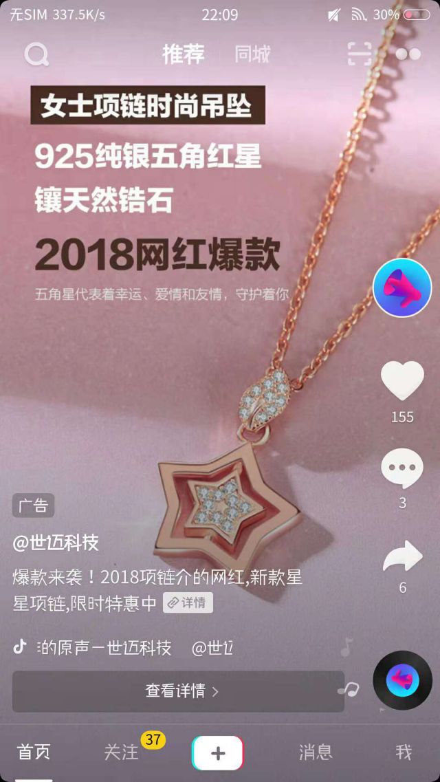 看起来还不错,项链吊坠也很时尚。然后还是网红款,现在各大平台都有自己的网红,然后通常很多爆款都是由网红带火的,所以可以尝试购买了。广告内容视频是录屏+BGM背景音乐,视频内容就是吊坠的多个角度的图片。