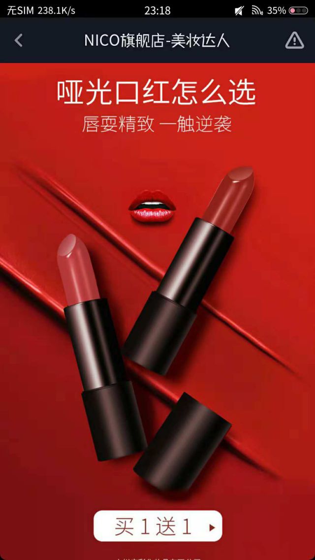 抖音信息流广告日常案例聚焦营销和精准营销 这次是要跟大家介绍NICO的口红。 女生天生爱美,所以她可能没有好看的衣服包包,但口红一定会有的,口红最尴尬的问题就是喝水,杯边会留口红印,这样就很尴尬。关于口红还有一个问题就是,口红怎么抹才均匀!?而NICPO口红就从口红不沾杯作为卖点来跟大家介绍,NiCO有多种口红色号可以为大家所选择的。在广告视频之中,也有跟大家分享,口红怎么涂抹才才不沾杯等等,但是NICO口红本身就不会沾杯的哈哈哈,再此突出卖点。 口红这么好,上哪里买呢?在广告视频快要结尾的时候,会告诉大家购买方式:比如上天猫搜索NICO口红哇,或者是通过点击广告链接来购买。 点击广告链接就进入落地页,如下图: 口红不沾杯就算了,还有买一送一的活动!这活动我肯定得参与!