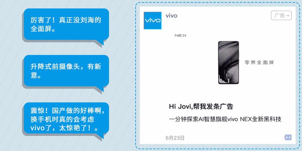 今日,vivo推出vivo全新机型X23在微信朋友圈惊艳线上线下营销亮相,在近3月以来,vivo的NEX、X21几乎都投放了微信朋友圈广告。似乎微信朋友圈广告成了vivo的发布会。
