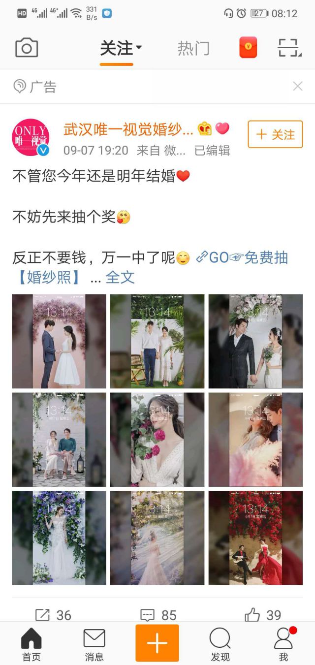 随着人们对浪漫的表现形式有更多的了解,婚纱摄影已经成为生活中不可或缺的一部分,利用网络选择合适的婚纱摄影机构是非常重要的,在网络上我们也能够找到一些不同的数据信息等来帮助我们找到一家婚纱摄影机构并且判断他们适不适合我们自身的需求。 唯一视觉婚纱在微博广告中采用短文案+九宫格图片形式进行展现,九宫格图片每一张都选取最漂亮的一种风格代表,场景不同所拍摄的不同风格,文案中,免费抽奖,对于潜在目标客户来说非常有吸快手视频广告引力,抽的到赚了,抽不到没有损失了解一下。 选择微博广告的优势在哪? 微博信息流广告基于微博强大的社交属性,能够与粉丝进行零距离沟通,充分了解广告效果以及粉丝lols10宣传片的需求,同时及时对广告内容和方案进行合理的调整 微博拥有海量用户资源,用户覆盖全国各个城市和地区,给微博广告传递提供了更广的范围,广告曝光高,能够吸引更多的意向客户和潜在粉丝,并且微博精定向,广告转化率高。 微博广告基于其强大的社交属性,广告主推广的的信息危机公关国内外研究文献综能够实现二次传播,并且二次传播不收取费用,对于广告主来说,性价比是非常高的 ![]()