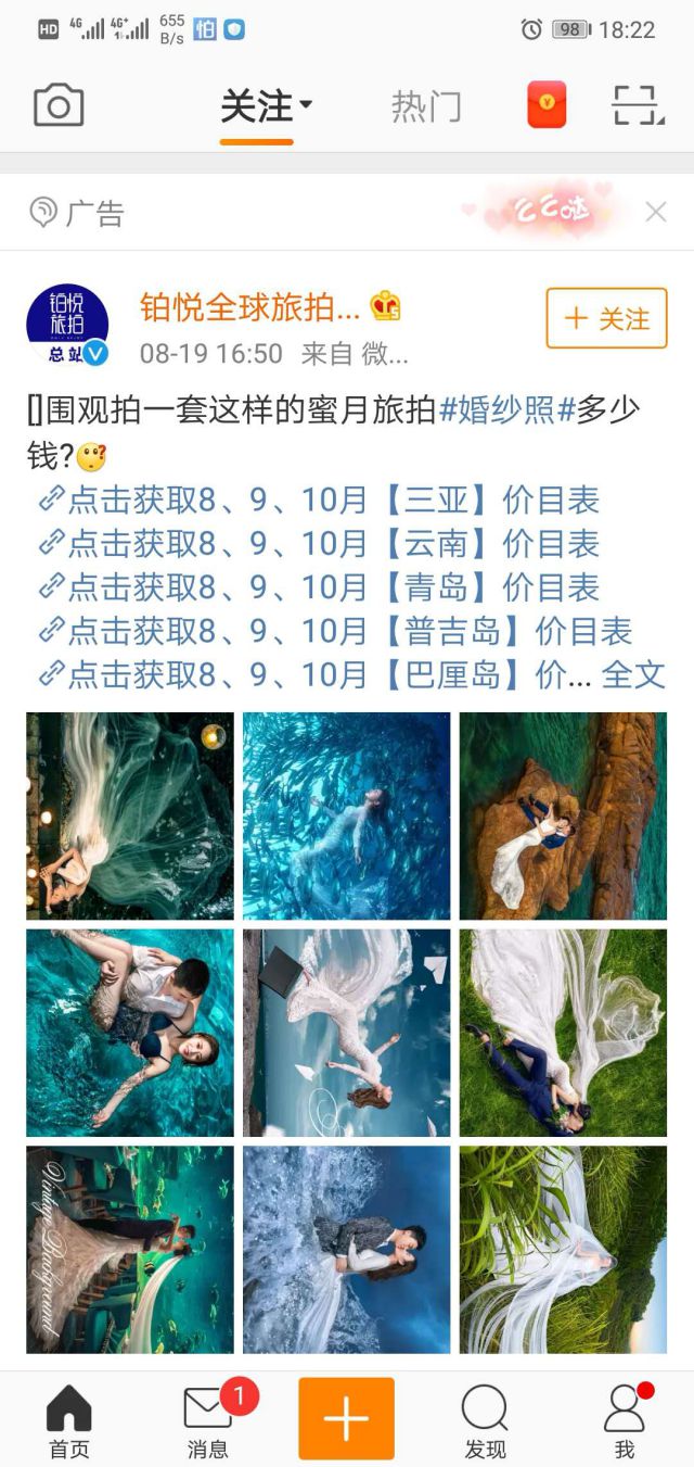 现在我们都喜欢用照片来留下一些我们生命中美好的回忆,这样我们老区的时候还能用照片回味一下,婚纱摄影现在越来越流行,很多人都喜欢到旅游热门的地方去拍婚纱照,现在旅游热门城市婚纱摄影的确是做得非常请叙述危机公关工作中的不的不错的,能够让人感觉到不一样类型的婚纱摄影。 铂悦全球旅拍就是一个旅拍的摄影,并且拍摄的地方都是人们旅游地点,有海网络公关案例的地方,该广告是以九宫格形式展现,我们可以清晰的看到,九张图都非常唯美,吸引人,整个画面都弥漫一种浪漫干净的气息。文案中也开头抛出疑问,拍一套这种旅拍婚纱照多少钱?抓住用户对价格敏感的心理,来吸引用户关注了解。 婚纱行业选择微博广告的优势 微博拥有海量用户资源,用户覆盖全国各个城市和地区,给微博广告传递提供了更广的范围,广告曝光高,能够吸引更多的意向客户和潜在粉丝 精准定向投放,广告转化率高,微博广告系统汕头小程序能够识别用户属性,例如年龄、性别、兴趣爱好、地域、设备等,并通过这些用户属性帮助广告主进行筛选,实现广告定向投放。因此推广信息所触达的用户是非常精准的,收到信息的都是对品牌感兴趣的意向用户或者潜在用户,进而提升广告转化率。 ![]()