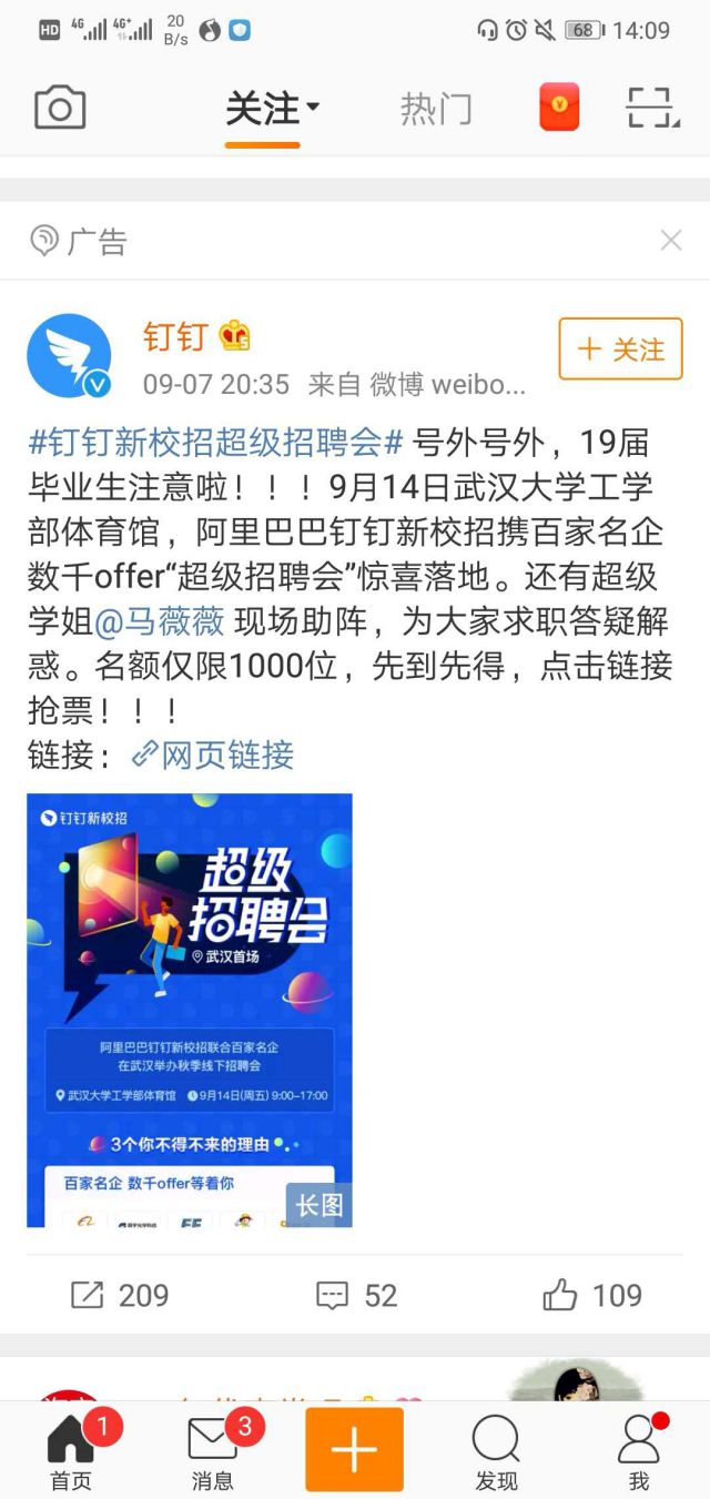 钉钉是阿里巴巴集团专门为中国企业打造的免费沟通和协同的多端平台,简单来说,钉钉不需要消耗你的流量,如果你是普通用户,每月一百元免费通话,企业的话每月一千分钟,钉钉也有群组,不知道大家有没有企业微信,用过企业微信的就比较好理解了,这一点差不多,群组的消息发出去之后会显示几个人已读,正在输入信息也能清楚看到,而钉钉就是能看到谁读了,谁没读。 此次钉钉在微博投放的广告,在校园招聘会使用钉钉,可以通过钉钉校招找工作,并且现场有人为大家解答疑惑,名额1000,先到先得,在这毕业找工作特别困难的时候,这对于大学生来说,非常有吸引力。 选择微博广告原因是什么? 微博用户群体庞大,全网营销全网营销并且大学本科以上学广告位历偏多,青少年居多,钉钉在微博中网络营销推广应该怎么做投放广告,正是符合微博这个优势。 微博用户覆盖全国各个城市和地区,给微博广告传递提供了更广的范围,广告曝光高,能够吸引潜在用户和粉丝的注意力。 ![]()