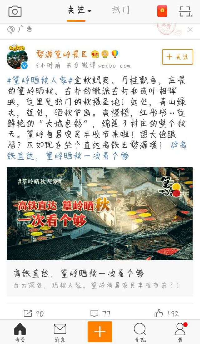 又到了凉爽快意的秋季,旅游就成了目前最为火热的一个讨论话题,正逢中秋、国庆小长假,是个出游的好时机。各大景区也开始进行了广告宣传,下图是一张婺源篁岭景区在微博上投放的信息流广告样式,利用微博话题功能进行篁岭晒秋的讨论,让用户进行参与话题讨论。
