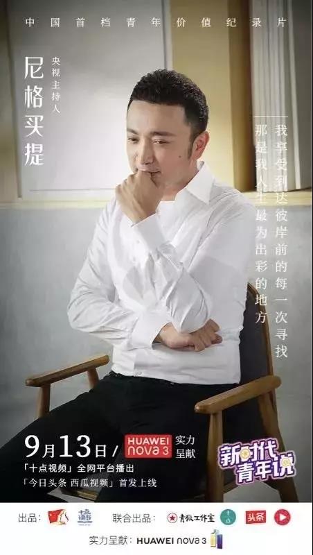 近段时间,和在互联网内容领域的动作越来越频繁,全媒体业务版图也越拓越宽,而其所参与的不同形态、模式的内容也给市场注入了新的活力,呈现出新的观感。9月11日,团中央宣传部和十点视频联合发起,十点视频、西瓜视频联合出品,今日头条、西瓜视频全网首播,HUAWEI nova 3实力呈献的《新时代青年说》刚一上线,便引发了广大青年群体的关注和讨论。 节目通过精选优质、实力、典范青年,以嘉宾自述、嘉宾经典推荐的短视频内容形式,传递新时代背景下青年的优秀品质,形成榜样作用,以引发广大青年群体感悟和思考。 首期节目中,知名青年主持人尼格买提就自己在成长过程中的职业选择,主持经历的挑战,以及现阶段关于人生的一些感悟等进行了分享,让当下青年人在困境和焦虑产生一定的共鸣,而他所强调的“人生真正出彩的地方,在于你寻找的过程当中,当你到达彼岸,到达目标,也许一切都索然无味了”,也给了青年人一定的指引和借鉴。