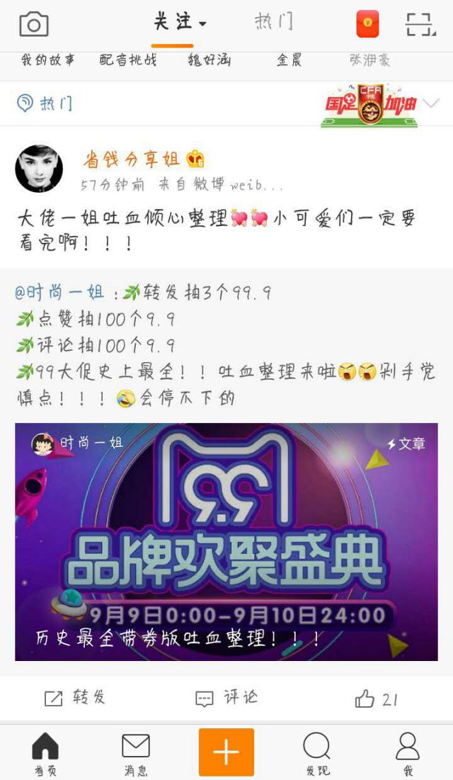 在这个网络时代,我们的吃、喝、用、穿等都可以在网上进行购买,大大节约了我们的时间,非常方便。看到线下经常会有活动促销折扣、日常还价等,线上购物很少可以还价,但是有个非常让人喜欢的可以领券购物。我们会经常看到下载某某APP进行领券购买便宜很多钱,现在都是微博进行关注,无需下载APP,会为你主动与推送优惠券,你也可以进入他的微博中有专门搜索的页面。下图是一则关于领券的广告截图。