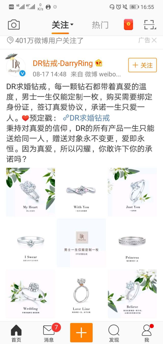 DR钻戒(Darry Ring)品牌从诞生起便立下浪漫规定,男士凭身份证一生仅能定制一枚,赠予此生唯一真爱的女士,寓意“一生·唯一·真爱”。我们每个人都会在适当的时候收到你想要的戒指,DR钻戒与其他钻戒不同的是,男士一生只能定制一枚,购买的时候需要绑定身份证,承诺一生只爱一人。 下面是DR钻戒在微博投放的广告,广告被400多万用户关注,它以信息流广告展现,文案+九宫格图片结合,对于婚戒这类广告,又是特别浪漫,与众不同的钻戒,哪些药品有广告关注的人自然很多,容易被吸引。 选择微博广告的原因? 微博拥有海量用户资源,用户覆盖全国各个城市和地区,给微博广告传递提供了更广的范围,广告曝光高,能够吸营销策划过程引更多的意向客户和潜在粉丝,精准的定向,广告触达率高。 微博广告基于其强大的社交属性,广告主推广的的信息能够实现二次传播,并且二次传播不收取费用,对于广告主来说,性价比是非领导力危机公关意识常高的 ![]()