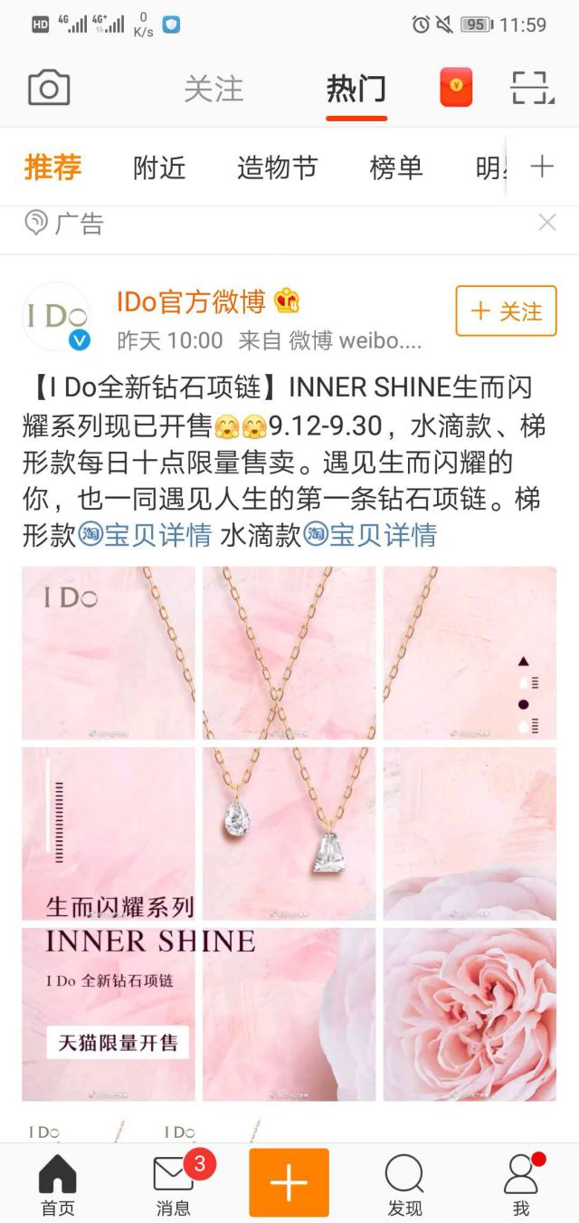 钻戒不仅是时尚的新宠儿,也是爱情的信物,这是为什么呢,因为钻石的坚贞象征着爱情的坚贞,“钻石恒久远,cloudflare w一颗永流传”,而对于钻戒品牌的佼佼者,IDO大家了解吗?IDO钻戒款式精美,很是适合年轻人的佩戴。 IDO,我愿意,每每看到这句话,都会想到两个相爱的人步入婚礼的殿堂许下的誓言,是的,我愿意,他代表着爱侣对于爱情的忠贞不渝的承诺,他所针对的消费群体是年轻群体消费者,年轻人对时尚品要求很高,希望走在时尚的前端,一段时间会有最新款,所以IDO这次新款水滴款、梯形款9.12~9.30号之间每日十点限量售卖。 IDO在微博热点推荐页以信息路的方式进行展现,IDO为什么会选择微博广告? 微博广告投放是企业品牌专业电商店铺运营推广的首选,基于微博海量用户资源,企业品牌的推广信息能够触达更大范围的目标人群,实现企业价值,微博用户年轻用户是微博主力群体,与产品的定位人群相符合。 微博拥有海量用电视广告哪些户资源,用户覆盖全国各个城市和地区,给微博广告传递提供了更广的范围,广告曝光高,能够吸引更多的意向客户和潜在粉丝 ![]()