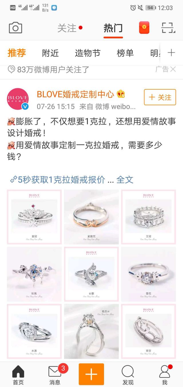 BLOVES婚戒定制中心是中国婚戒定制的开创及领导品牌,可能我们没有定制过,但是也了解一点,这两年比较流行的定制戒指,一个故事,一枚婚公关危机日语戒,每一枚婚戒都是一个独一无二的故事完成的。 此次BLOVE婚戒在微博以信息流方式进行展现,采用九宫格+短文案的形式,九种不同样式的婚戒以图片的方式展现在用户面前,每个人都有一段刻骨铭心独一无二的爱情故事,文案中说用爱情故事定制一克拉婚戒,需要多少钱,对于大部分用户来说,都会有想要去了解的念头,都会被吸引,想测试自己的爱情故事定制婚戒,多少钱? 微博广告具有评论、转发、点赞的功能,我们可以看到83万微博用户关注了,微博广告可以讲广告24小时不间断传播,微博用户数量庞大,通过转发,讨论。只要是有网的地方,任何人在任中国式过马路危机公关何地点任何时间都可以阅读。 微博拥有海量用户资源,用户覆盖全国各个城市和地区,给微博广告传递提供了更广的范围,广告曝光高,能够吸引更多的意向客户和潜在粉丝。 微博广告基于其强大的社交属性,广告主推广的的信息能够实现二次传播,并且二次传播不收取费用,对于广告主来说,性价比是非常高的。 ![]()