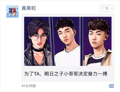 现在的饮品的品牌开始越来越多,市场竞争也愈演愈剧烈。真果粒就推出了朋友圈广告,广告是借助《明日之子》的名头来进行文案的描写.图片上也是《明日之子》四强中的三个人的油画拼接做成的大图,非常吸引用户的眼球品牌营销策划具备那些优势,对广告的注意力也比较集中。 真果粒广告的目的不仅仅是为了挖掘潜在用户,更多的是让老用户想起自己,进行一定的品牌的推广方法消费。 真果粒牛奶一直都是大人小孩的最爱,进行朋友圈广告的传播使得更多的人进一步的知道,做成。利用朋友圈的互动特征,引发众多网友的口碑传播,激发广告的宣传力,对我们品牌的曝光具有一定的优势。