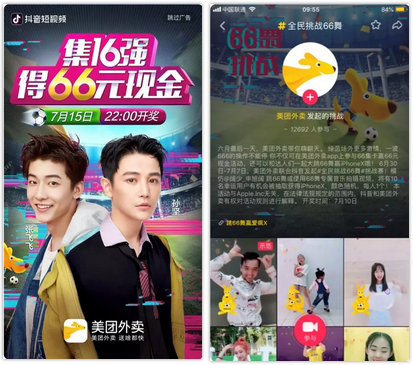 在抖音达人的流量影响下,不同年龄段用户自发参与#全民挑战66舞#挑战,创作热情持续高涨,各种创意内容层出不穷。有进行舞蹈变装的,各种造型齐演绎;有全家一起进行趣味创作的,极具乐趣;更有携自家萌宠加入的,搞怪十足。在用户的互动评论中,“嗨够了,就定美团外卖吧”、“我也录了哈哈哈,正好点了美团外卖”、“世界杯和美团外卖更配哦”等声音不断涌现,凝聚品牌口碑也实现了品牌与用户的深度连接。 抖音高价值广告资源,强势引流加强品牌曝光 黄金广告投放资源,可以帮助大幅缩短品牌与用户的沟通路径,提高效率。此次合作中,美团外卖整合了抖音平台开屏、发现页Banner、发现页热搜、挑战视频置顶、品牌挑战页、站内消息等强势资源进行配合,实现用户参与挑战赛路径的全覆盖,加强了美团外卖在抖音全平台的曝光,为#全民挑战66舞#挑战赛多触点导流。开屏这一黄金广告位第一时间抢占用户的注意力,上线首日就获得了3552.7万的媒体曝光量,媒体数据达5.19%,激发平台内更多用户的参与。