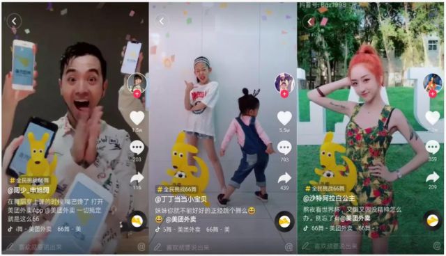 此外,挑战赛中使用的美团外卖“萌趣小袋鼠”形象贴纸,更增加了视频的生动性和互动性,随着舞蹈动作的进行,“小袋鼠”也开始舞动起来,为视频打造出“惊喜感”,很多用户表示愿意使今日头条信息流广告用,这也大大增强了美团外卖品牌的有效曝光。 融入了定制BGM和萌趣贴纸的66舞火力大增,短时间内#全民挑战66舞#迅速引发广泛传播,成功建立了美团外卖品牌与用户沟通的重要通道。 达人激发挑战赛高流量,持续引发用户参与热情 KOL自带流量,能有效带动普通用户参与。美团外卖深挖抖音平台达人属性,在@丁丁当当小宝贝、@阔少_申旭阔、@沙特阿拉白公主、@可乐嘟嘟酱、@李政廷等与品牌调性相契合,深受抖音用户欢迎的达人群体带动参与下,发出的66舞创意挑战视频,吸引了不同圈层用户参与互动,助力活动收获35万原创视频、12万赞、1846条评论、915条转发。在活动引爆阶段发挥了关键作用,有效提高了美团外卖品牌声量。