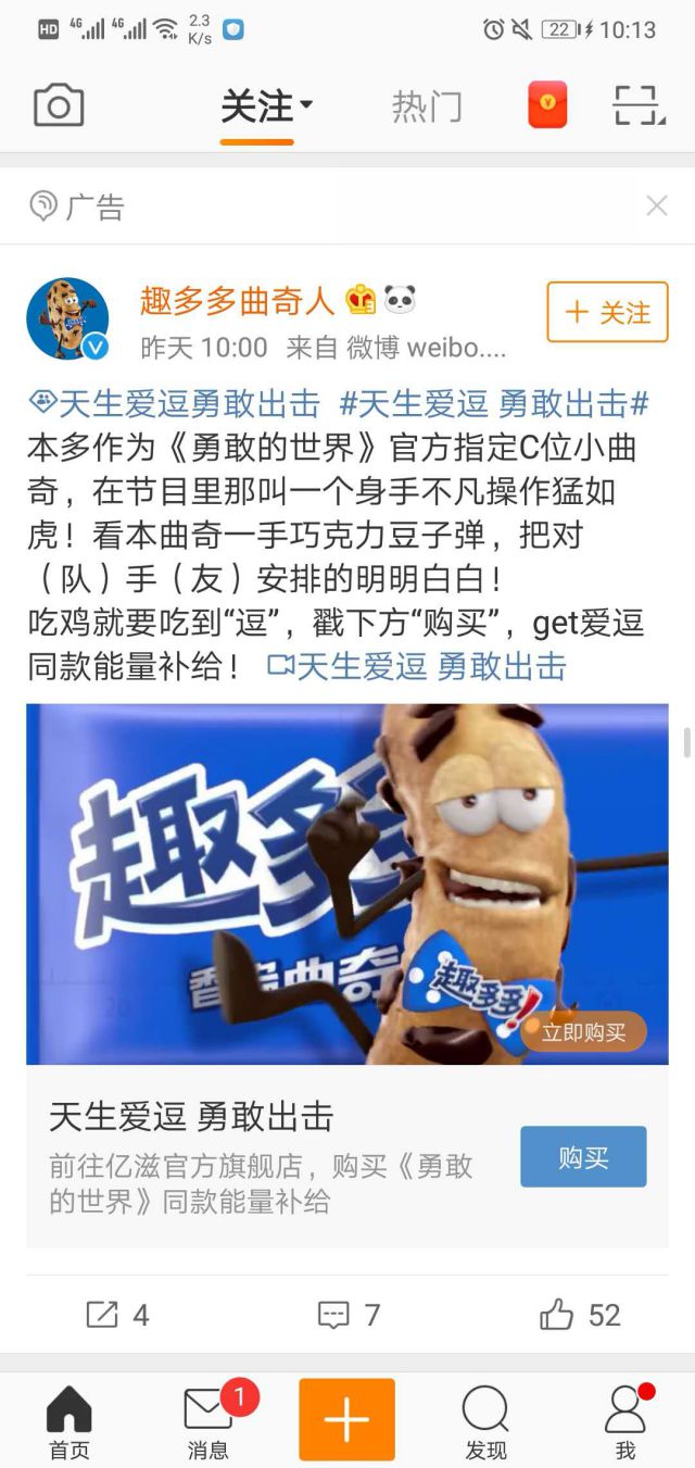 趣多多是美国及受欢迎的曲奇饼干品牌,但是在中国市场销量却不是很明显,并且,消费者对趣多多的品牌认知度也不高,趣多多是集酥松的奶油曲奇和香醇的巧克力于一身饼干,是卡夫食品有限公司的产品之一。 趣苏州电视台广告多多在2009年时,将产品品牌定位于“FUN”,我们也在看电视上看过许多关于趣多多卡通形象的广告,带给许多工作生活压力大的人,需要宣泄的人群开心的一面。将时尚有趣的趣多多结合年轻、互动体验的土豆,打造更加出众的品牌印象。 此次趣多多也是以搞笑的形象出现,结合当下最火的吃鸡游戏,曲奇一手巧克力豆子弹,广告中购买《勇敢的世界》,get爱逗同款能量补给。 微博拥有海量用户资源,用户覆盖全国各个城市和地区,给微博广告传递提供了更广的范围,广告曝光高,能够吸引更多的意向客户和潜在粉丝 微博广告可以讲广告24小时不间断传播,微博用户数量庞大,通过转发,讨论。只要是有网的地方,任何人在任何地点任何时间都平台推广广告推广可以阅读,对于吃的东西用户还是比较关注的。 ![]()