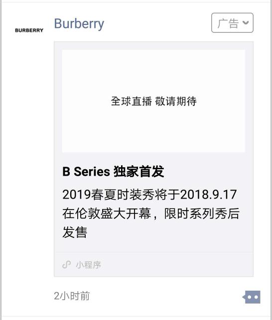 小提示:您应该对本页介绍的“Burberry微信朋友圈广告案列分析”相关内容感兴趣,若您有相关需求欢迎拨打我们的服务热线或留言咨询,我们尽快与您联系沟通Burberry微信朋友圈广告案列分析的相关事宜。